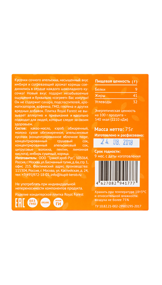 Шоколад из кэроба Royal Forest с апельсином, имбирем и корицей